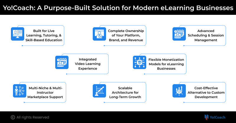 Building a custom eLearning or tutoring platform from scratch requires significant investment in development, testing, and ongoing maintenance. Yo!Coach reduces this burden by offering a market-tested, ready-to-launch solution.