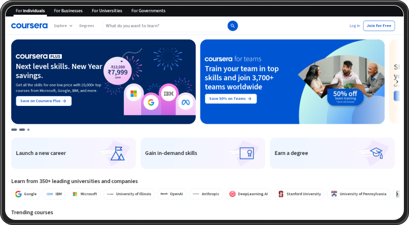 Coursera has established itself as a leading platform for structured, credential-focused online education by partnering with universities, institutions, and global organizations. The programs offered by Coursera include high-quality courses, professional certificates, and full degree programs. Its strength lies in its strong focus on career alignment, guiding learners through structured pathways that connect education directly to job roles and industry demands.