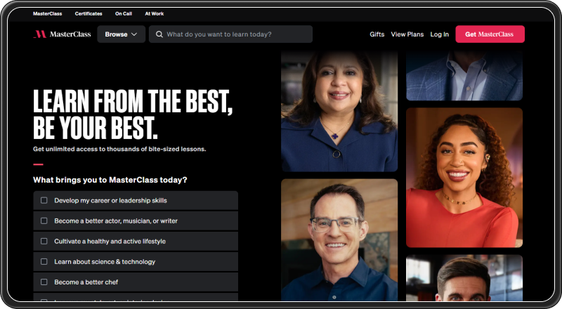 MasterClass positions learning as a premium, inspirational experience by delivering high-production classes taught by globally recognized experts and public figures. The platform focuses more on storytelling, insight, and motivation than step-by-step instruction, which makes it appealing for aspirational learning. While its branding and content quality are unmatched, MasterClass does not support interactive learning, certifications, or independent educator participation, limiting its applicability for structured skill development.