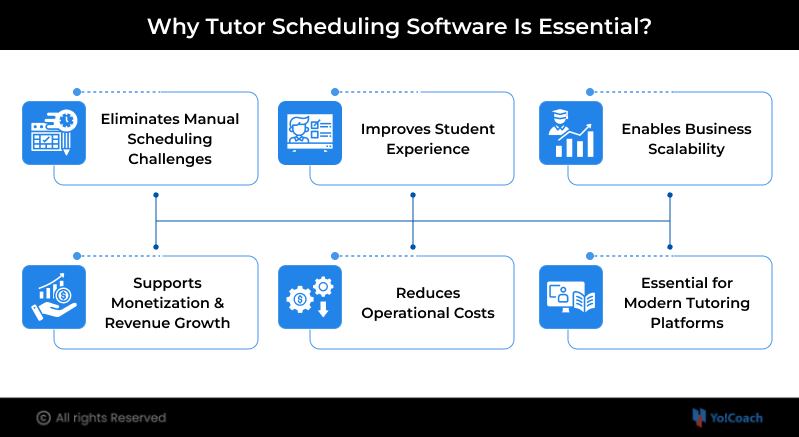 For tutoring marketplaces and edtech startups, scheduling is only one part of a larger ecosystem. Purpose-built solutions like Yo!Coach combine scheduling with tutor discovery, video sessions, payments, and admin controls, making them essential for businesses planning long-term, scalable growth.