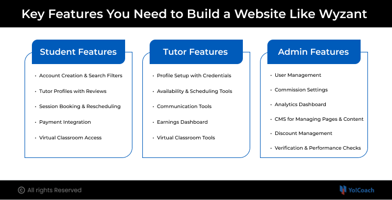 Developing a marketplace requires distinct sets of features tailored to the three primary user roles: the student, the tutor, and the administrator. In 2026, these features must be robust, intuitive, and integrate modern ed-tech standards.