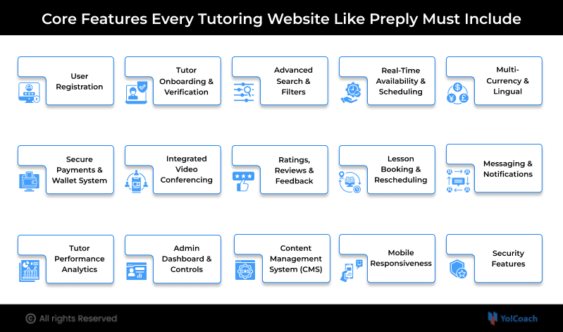 To build a tutoring platform like preply that can compete with top global learning marketplaces, it’s essential to incorporate a comprehensive set of features. These features not only enhance the user experience for learners and tutors but also streamline platform management, boost engagement, and drive revenue.