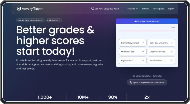 Varsity Tutors offers a broad tutoring ecosystem that includes one-on-one tutoring, small group classes, and live online courses. It supports both academic subjects and standardized test preparation. Unlike open marketplaces, Varsity Tutors follows a more managed approach that closely aligns with Revolution Prep’s approach.