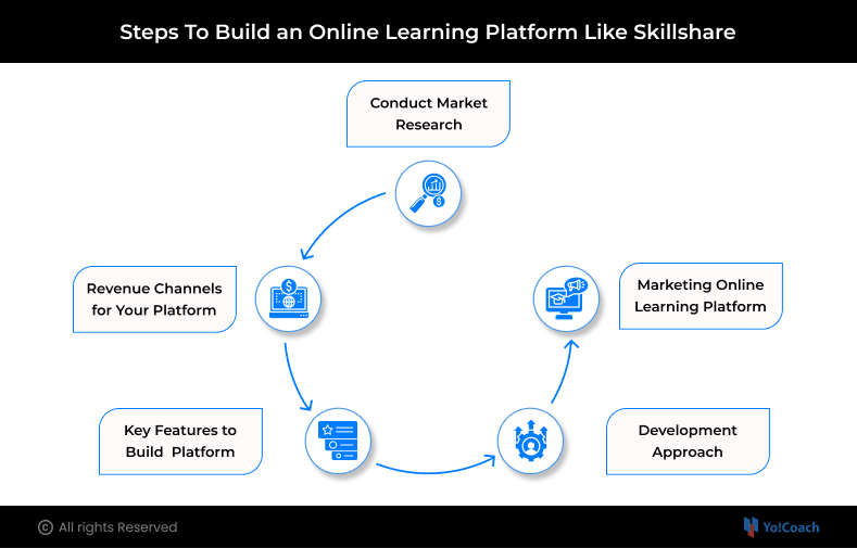 Launching a Skillshare-style learning platform is not about copying an existing model but about designing a differentiated, creator-first ecosystem. The most successful platforms are built on clear positioning, learner-centric experiences, and tools that empower instructors to grow alongside the business. Given below is 5 step guide to help you launch an online learning platform like Skillshare: