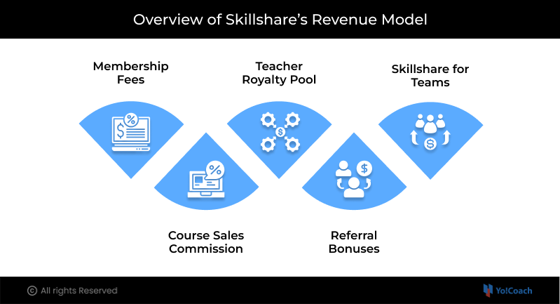 Building a platform like Skillshare requires an understanding of how value is monetized across learners, creators, and businesses. Skillshare operates on a subscription-based revenue model, but the true differentiator is its Teacher Royalty Pool. This structure aligns platform growth with creator success, ensuring that quality and engagement directly translate into earnings. Further, let’s explore some of the key revenue streams of Skillshare: