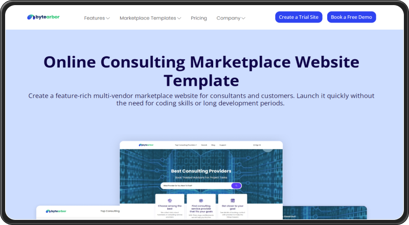 ByteArbor provides ready-made marketplace website templates, including a consulting marketplace option. These templates offer a structured starting point, but platform owners must handle hosting, setup, and further development.