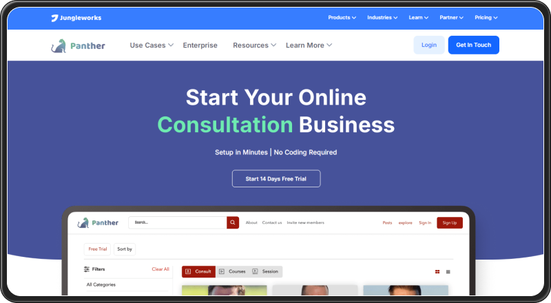 Panther (by Jungleworks) is a SaaS-based marketplace platform that enables you to set up a consultation marketplace quickly without coding. It focuses on booking management, expert discovery, real-time communication, and payments.
